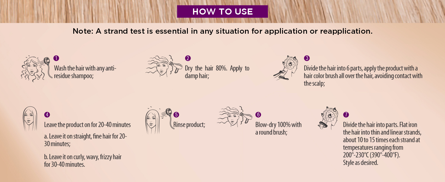 Apply on clean, damp hair, half a centimeter from the root, strand by strand, gently massaging. Leave it on for 20 to 30 minutes. Rinse well. Finish with a blowout. Using a hair straightener is optional. Note: The straight hair effect will be gradual on very curly and resistant hair. Several applications will be necessary to obtain a straighter effect and the time between one application and another must be 15 days.